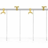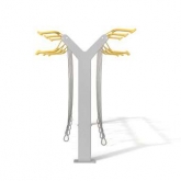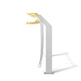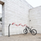 Modular bike rack composed of a steel structure made of two vertical supports and a horizontal aluminum bar, equipped with aluminum supports for bike handlebars, positioned at two different heights. Each parking spot is equipped with a steel cable coated with PVC that allows to secure the frame of the bike.