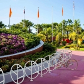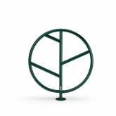 Modular bike rack composed of a steel structure made of two vertical supports and a horizontal aluminum bar, equipped with aluminum supports for bike handlebars, positioned at two different heights. Each parking spot is equipped with a steel cable coated with PVC that allows to secure the frame of the bike.